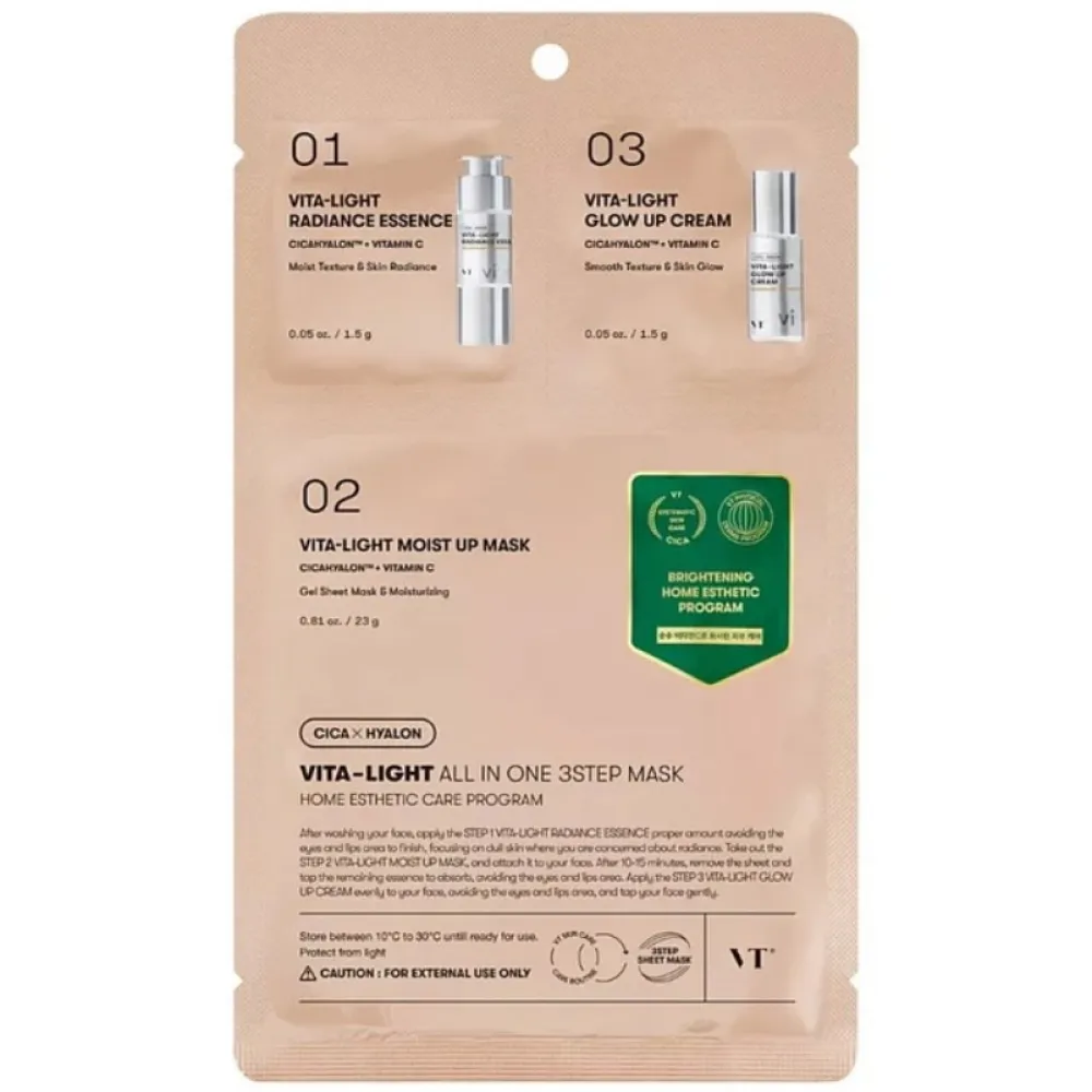 VT Cosmetics - Vita-Light All In One 3Step Mask - a face mask consisting of 3 steps. It contains a concentrated serum, a sheet mask, and a cream to complete the care. It is designed to brighten pigmentation, improve tone, and intensely hydrate the skin. The product contains vitamin C, which gives the skin a healthy glow and reduces the visibility of signs of aging. Centella Asiatica extract soothes and regenerates, while hyaluronic acid improves hydration levels. Panthenol, along with trehalose, soothes irritation and cares for the protective barrier. Thanks to its 3-step form, the product guarantees the effect of intensive care at home.