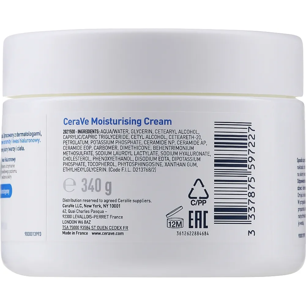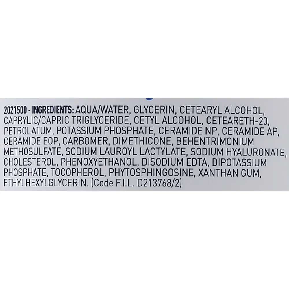 Ingredients: Aqua / Water, Glycerin, Cetearyl Alcohol, Caprylic/capric Triglyceride, Cetyl Alcohol, Ceteareth-20, Petrolatum, Dimethicone, Phenoxyethanol, Behentrimonium Methosulfate, Potassium Phosphate, Ethylhexylglycerin, Sodium Lauroyl Lactylate, Disodium Edta, Dipotassium Phosphate, Ceramide Np, Ceramide Ap, Phytosphingosine, Cholesterol, Xanthan Gum, Carbomer, Sodium Hyaluronate, Tocopherol, Ceramide Eop.