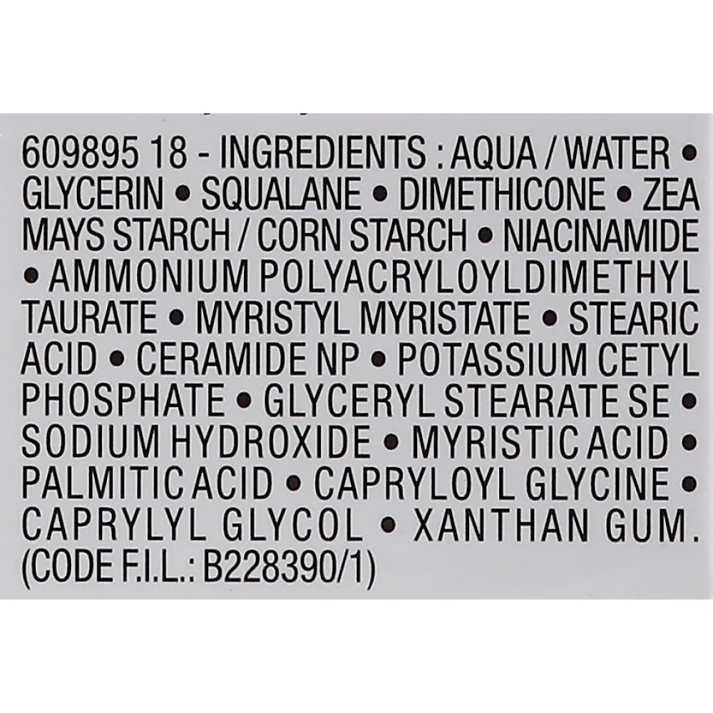 ingredients: Aqua / Water,Glycerin, Squalan, Dimethicone, Zea Mays Starch / Corn Starch, Niacinamide, Ammonium Polyacryloyldimethyl Taurate, Myristyl Myristate, Stearic Acid, Ceramide Np, Potassium Cetyl Phosphate, Glyceryl Stearate Se, Sodium Hydroxide, Myristic Acid, Palmitic Acid, Capryloyl Glycine, Caprylyl Glycol, Xanthan Gum
