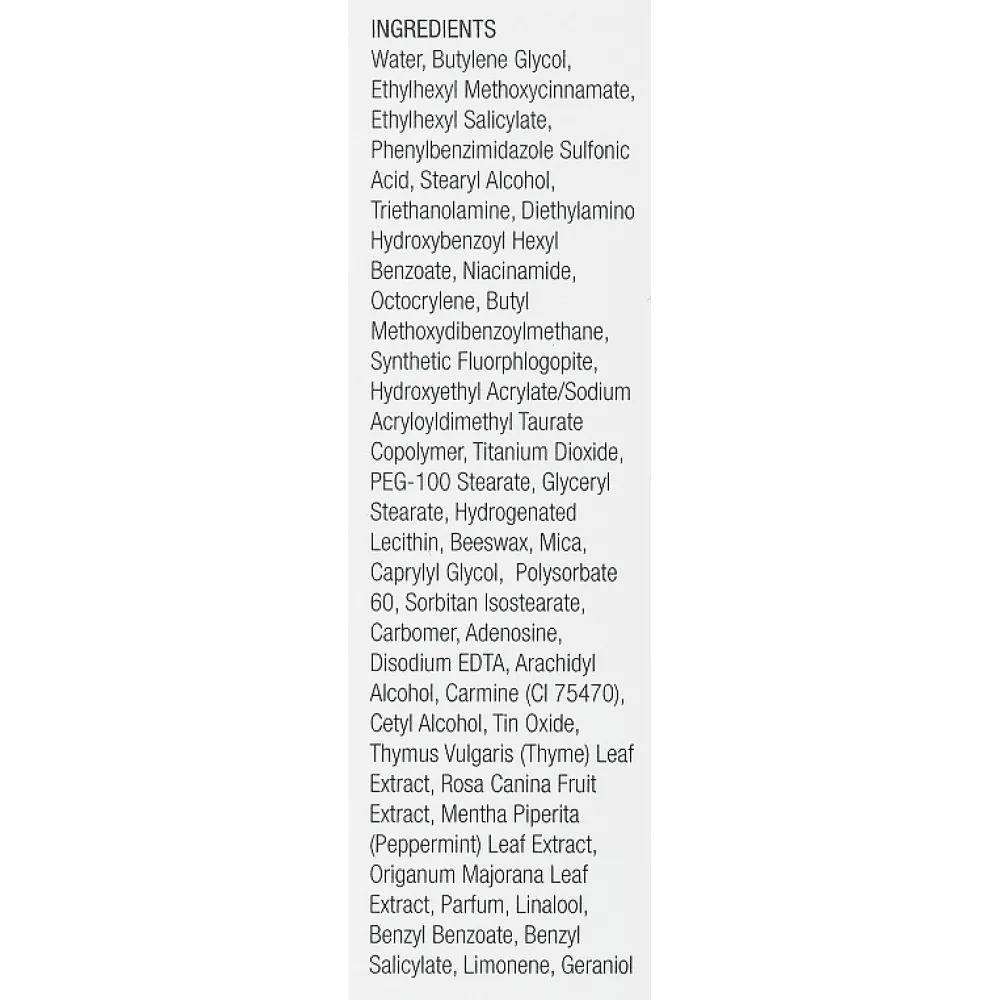 Skład: Water (Aqua), Butylene Glycol, Dibutyl Adipate, Butyloctyl Salicylate, Ethylhexyl Triazone, Diethylamino Hydroxybenzoyl Hexyl Benzoate, Niacinamide, Bis-Ethylhexyloxyphenol Methoxyphenyl Triazine, Terephthalylidene Dicamphor Sulfonic Acid, 1,2-Hexanediol, Mica, Synthetic Fluorphlogopite, Sodium Acrylate/Sodium Acryloyldimethyl Taurate Copolymer, Tromethamine, Behenyl Alcohol, Glyceryl Stearate, Sorbitan Sesquioleate, Potassium Cetyl Phosphate, Polyglyceryl -3 Methylglucose Distearate, Isohexadecane, Acrylates/C10-30 Alkyl Acrylate Crosspolymer, Polysorbate 80, Ammonium Acryloyldimethyltaurate/VP Copolymer, Sorbitan Oleate, Ethylhexylglycerin, Adenosine, Sodium Phytate, Tin Oxide, Rosa Canina Fruit Extract, Origanum Majorana Leaf Extract, Thymus Vulgaris (Thyme) Leaf Extract, Mentha Piperita (Peppermint) Leaf Extract, Fragrance(Parfum), Linalool, Benzyl Benzoate, Benzyl Salicylate, Limonene, Geraniol, Titanium Dioxide (Cl 77891), Carmine (Cl 75470)