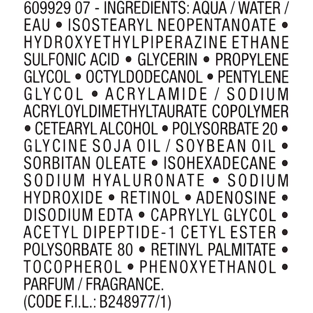 ingredients: Aqua/Water, Isocetyl Stearate, Glycerin, Octyldodecanol, Propylene Glycol, Pentylene Glycol, Dimethicone, Acrylamide/Sodium Acryloyldimethyltaurate Copolymer, Cetearyl Alcohol, Dimethicone/Vinyl Dimethicone Crosspolymer, Caffeine, Isohexadecane, Sodium Hyaluronate, Sodium Hydroxide, Retinol, Retinyl Linoleate, Adenosine, Ammonium Polyacryldimethyltauramide/Ammonium Polyacryloyldimethyl Taurate, Caprylyl Glycol, Citric Acid, Polysilicone-8, Polysorbate 80, Phenoxyethanol.