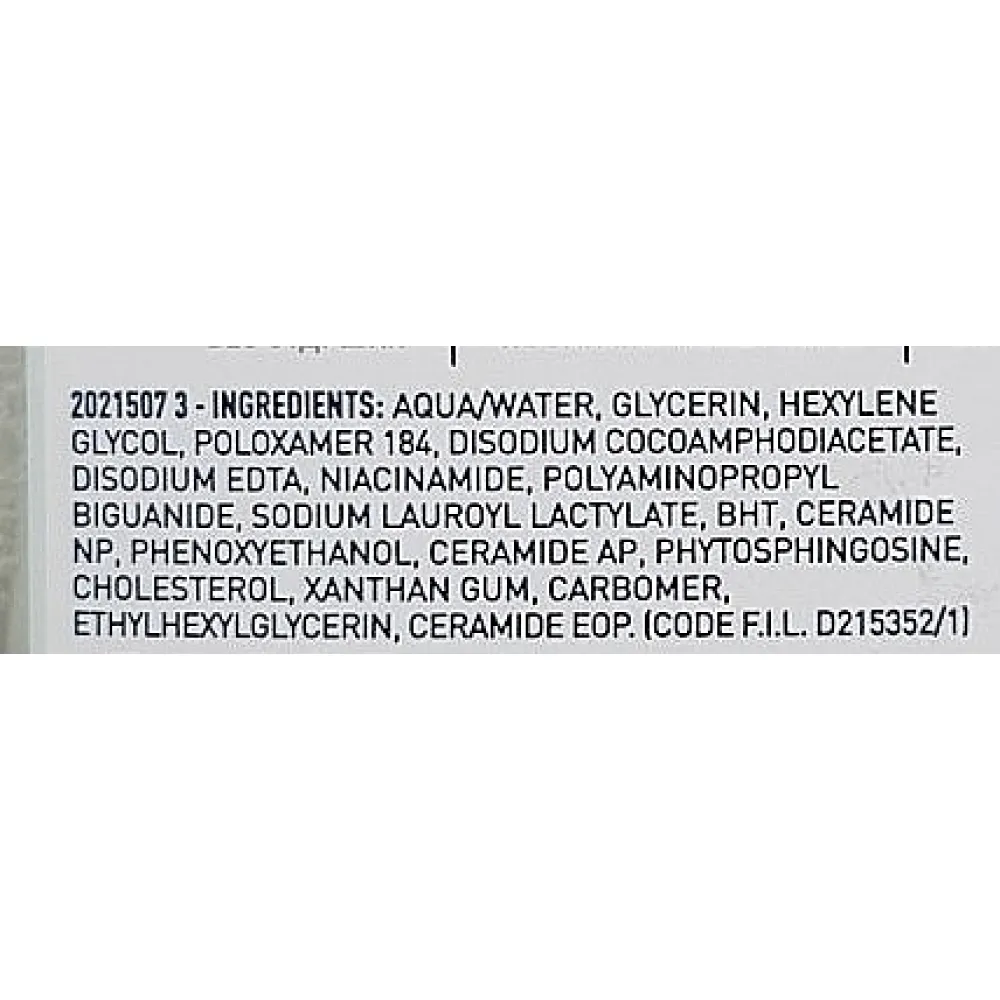 ingredients: AQUA/WATER, GLYCERIN, HEXYLENE GLYCOL, POLOXAMER 184, DISODIUM COCOAMPHODIACETATE, DISODIUM EDTA, NIACINAMIDE, POLYAMINOPROPYL BIGUANIDE, SODIUM LAUROYL LACTYLATE, BHT,CERAM AP, PHYTOSPHINGOSINE, CHOLESTEROL, XANTHAN GUM, CARBOMER, ETHYLHEXYLGLYCERIN, CERAMIDE EOP (FIL D215352/1).