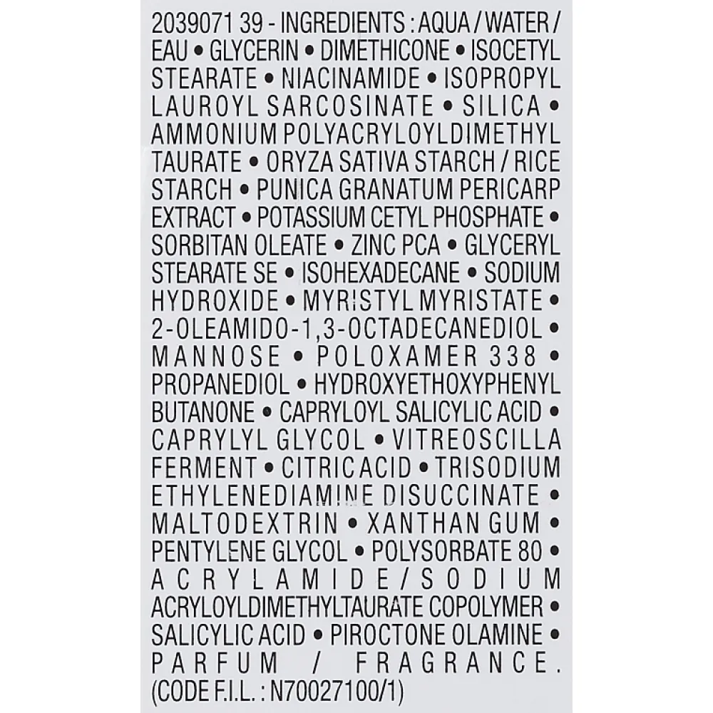 ingredients: Aqua, Glycerin, Dimethicone, Isocetyl Stearate, Niacinamide, Isopropyl Lauroyl Sarcosinate, Silica, Ammonium Polyacryloyldimethyl Taurate, Oryza Sativa Starch/Rice Starch, Punica Granatum Pericarp Extract, Potassium Cetyl Phosphate, Sorbitan Oleate, Zinc PCA, Glyceryl Stearate Se, Isohexadecane, Sodium Hydroxide, Myristyl Myristate, 2-oleamido-1,3-octadecanediol, Mannose, Poloxamer 338, Propanediol, Hydroxyethoxyphenyl Butanone, Capryloyl Salicylic Acid, Caprylyl Glycol, Vitreoscilla Ferment, Citric Acid, Trisodium Ethylenediamine Disuccinate, Maltodextrin, Xanthan Gum, Pentylene Glycol, Polysorbate 80, Acrylamide/Sodium Acryloyldimethyltaurate Copolymer, Salicylic Acid, Piroctone Olamine, Parfum