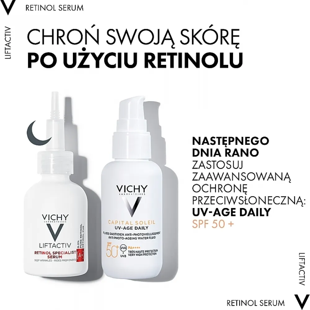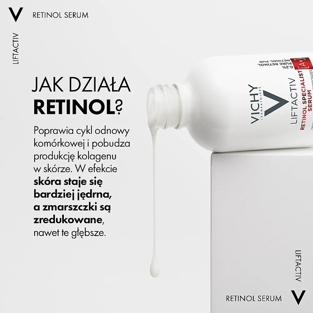 Serum Vichy Liftactiv Retinol Specialist — to potężny środek przeciwstarzeniowy, opracowany w celu korekcji głębokich zmarszczek i poprawy tekstury skóry. Jego formuła jest wzbogacona o 0,2% czystego retinolu, frakcje probiotyczne i kwas hialuronowy, co zapewnia intensywne działanie odmładzające. Serum nadaje się do wszystkich typów skóry, w tym wrażliwej, i nie zawiera substancji zapachowych.