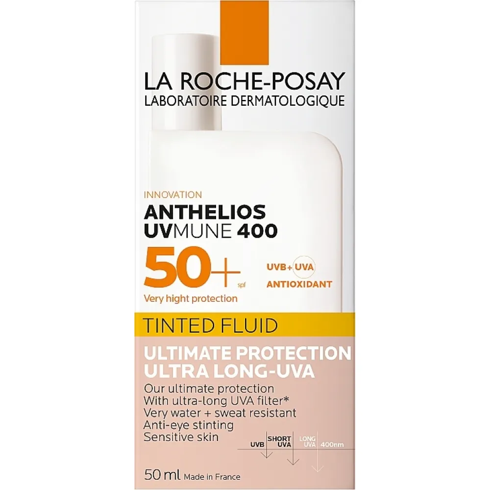 Антгелиос UVmune 400 Тонований Сонцезахисний Флюїд для Обличчя від La Roche Posay - це ваш ключ до бездоганної, оксамитової шкіри, захищеної від шкідливого впливу ультрафіолетового випромінювання та вільних радикалів. Він містить фотостабільні сонцезахисні фільтри нового покоління з високим рівнем захисту, SPF50+. Формула збагачена компонентами з антиоксидантними властивостями та технологією XL-ProtectTM, яка забезпечує додатковий захист епідермісу від інфрачервоного випромінювання та забруднення навколишнього середовища.