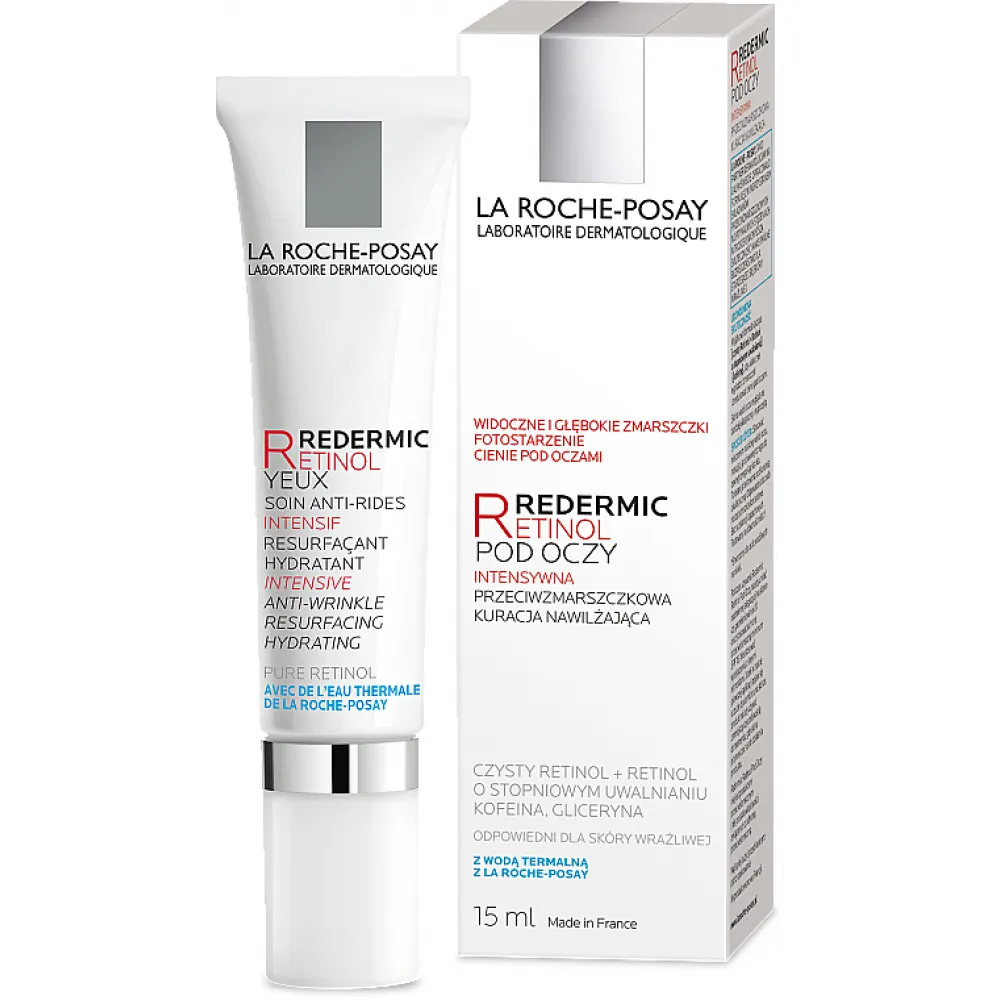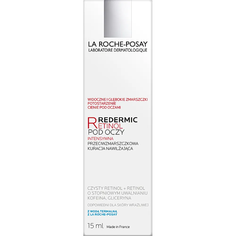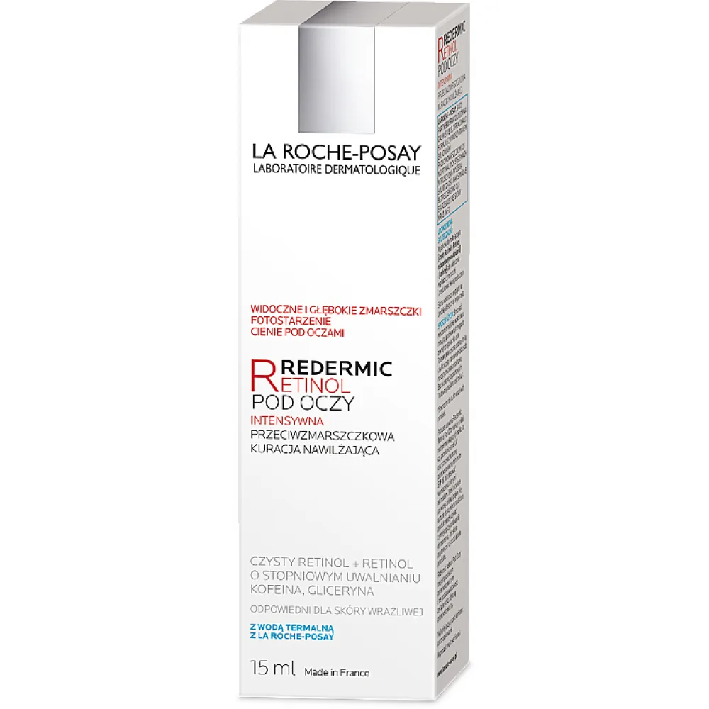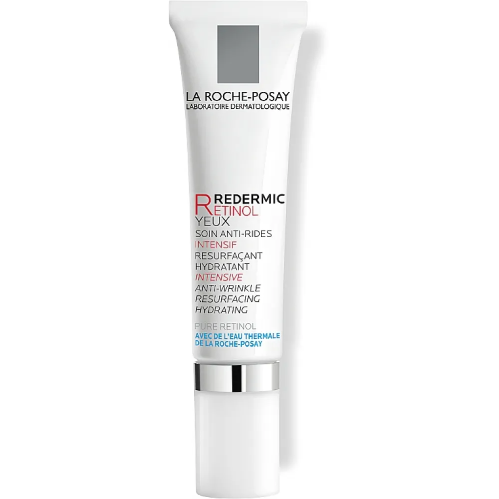 Продукт ефективно бореться з початковими ознаками старіння та містить Ретинол і Кофеїн для максимальної ефективності. Він забезпечує негайний видимий ефект ліфтингу, розгладжуючи зморшки, тонкі лінії та "гусячі лапки" навколо очей. Крім того, він усуває темні кола та мішки під очима, зменшуючи передчасні пошкодження від сонця. Кофеїн у складі допомагає очистити тьмяний колір обличчя та ознаки втоми. Продукт також збагачений термальною водою La Roche-Posay, яка надає заспокійливий та зволожуючий ефект на шкіру. Підходить навіть для чутливої зони навколо очей і пройшов дерматологічні випробування. Продукт не містить олій та парабенів.
