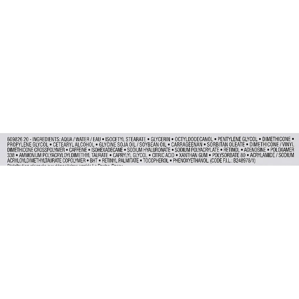 Aqua/Water, Isocetyl Stearate, Glycerin, Octyldodecanol, Propylene Glycol, Pentylene Glycol, Dimethicone, Acrylamide/Sodium Acryloyldimethyltaurate Copolymer, Cetearyl Alcohol, Dimethicone/Vinyl Dimethicone Crosspolymer, Caffeine, Isohexadecane, Sodium Hyaluronate, Sodium Hydroxide, Retinol, Retinyl Linoleate, Adenosine, Ammonium Polyacryldimethyltauramide/Ammonium Polyacryloyldimethyl Taurate, Caprylyl Glycol, Citric Acid, Polysilicone-8, Polysorbate 80, Phenoxyethanol.