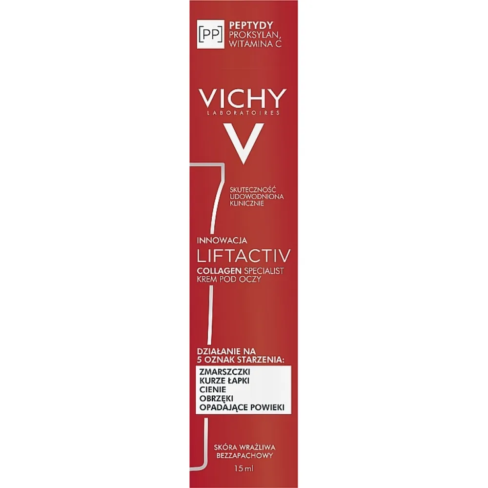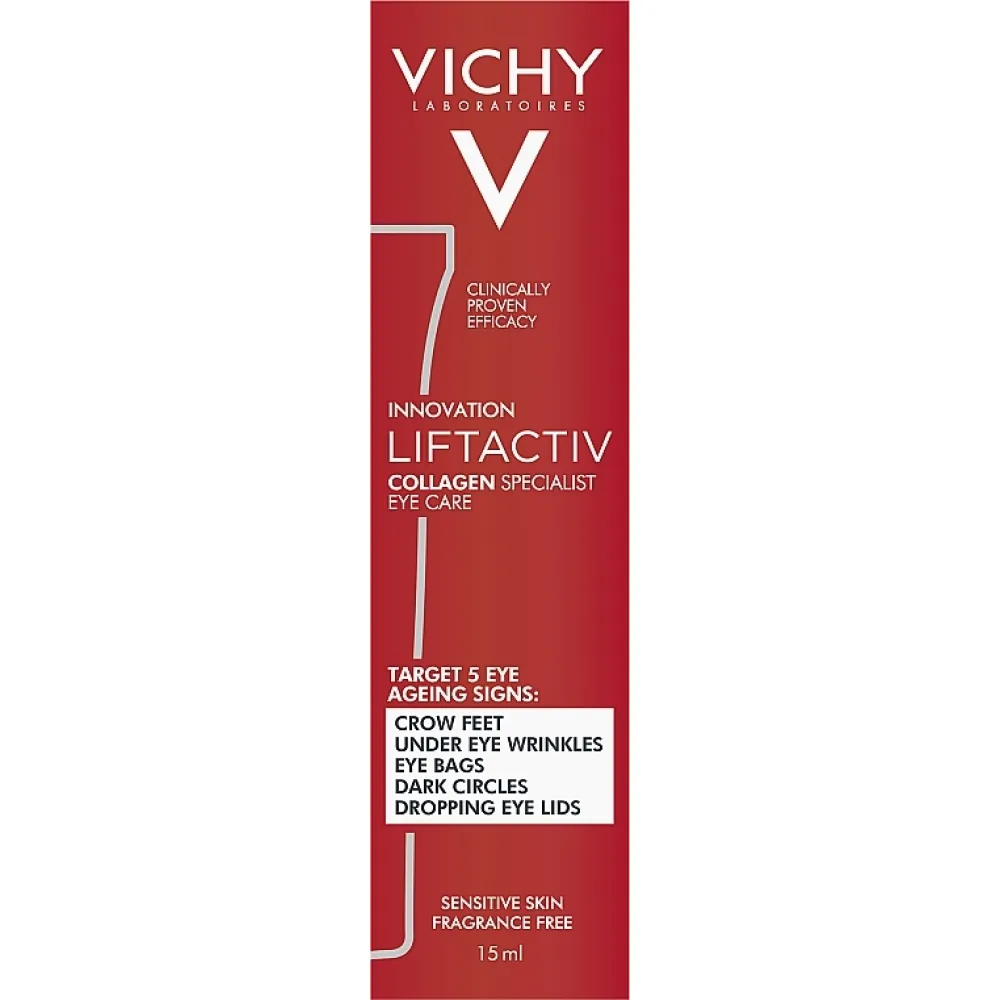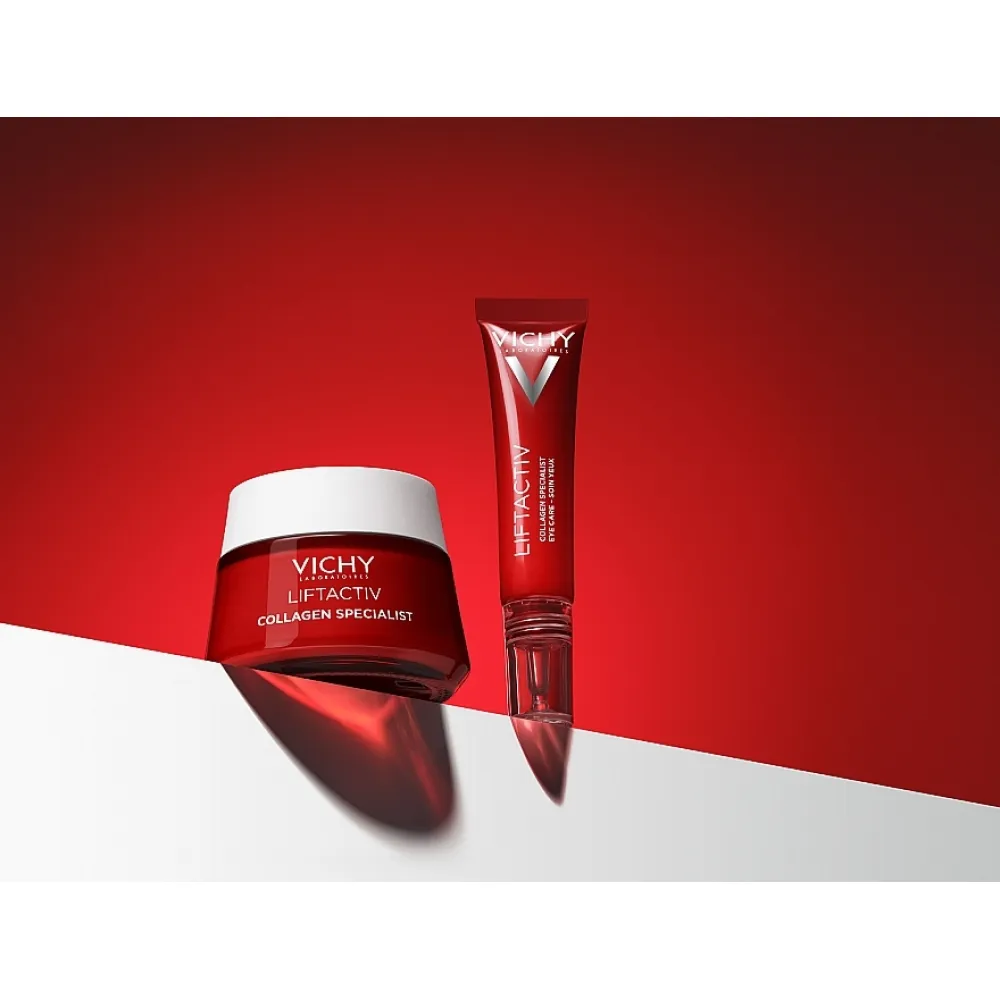 Крем Vichy Liftactiv Collagen Specialist Oogcrème — антивіковий догляд для шкіри навколо очей, спрямований на корекцію 5 ознак старіння: зморшки, набряки, темні кола, обвисання повік і втрату пружності. Формула збагачена Pro-Collagen Complex, стимулює синтез колагену, зміцнює шкіру та покращує її щільність. Підходить для чутливої шкіри та не містить ароматизаторів.