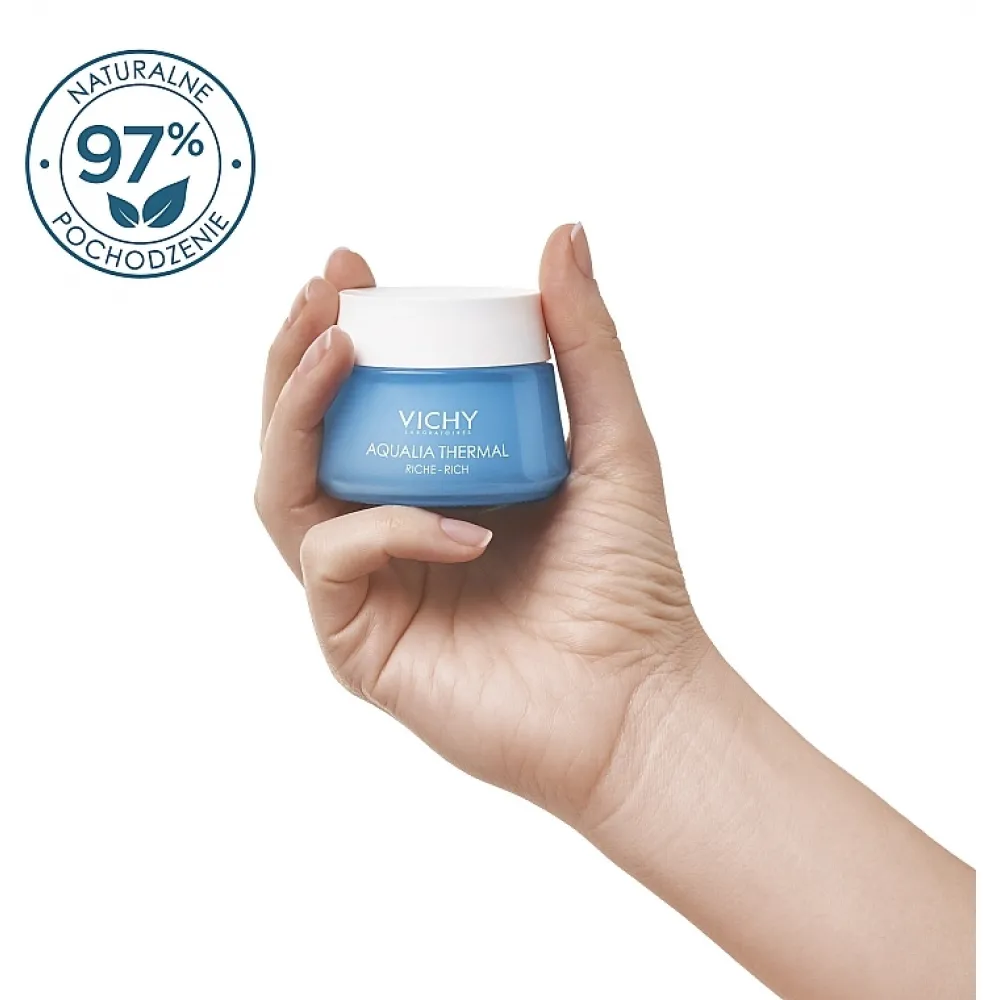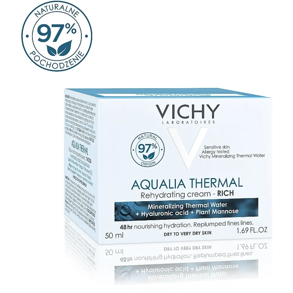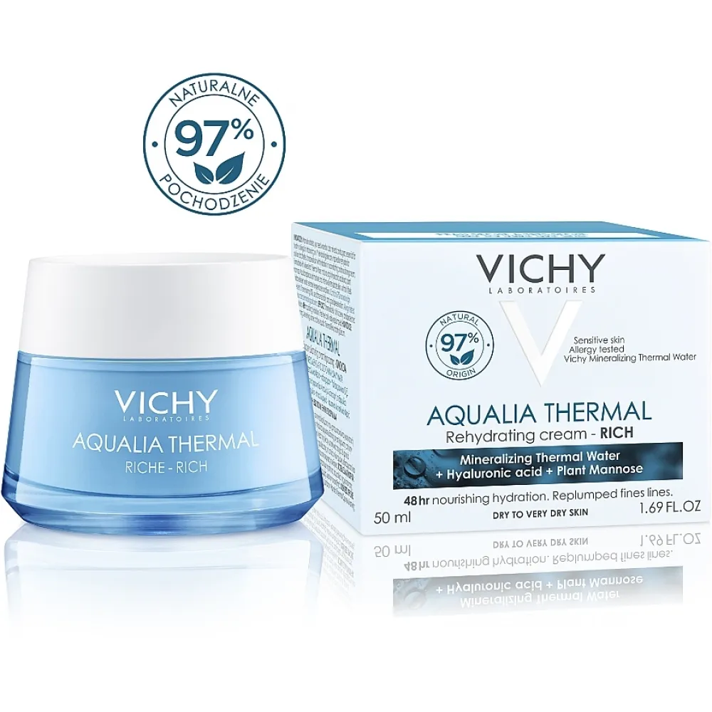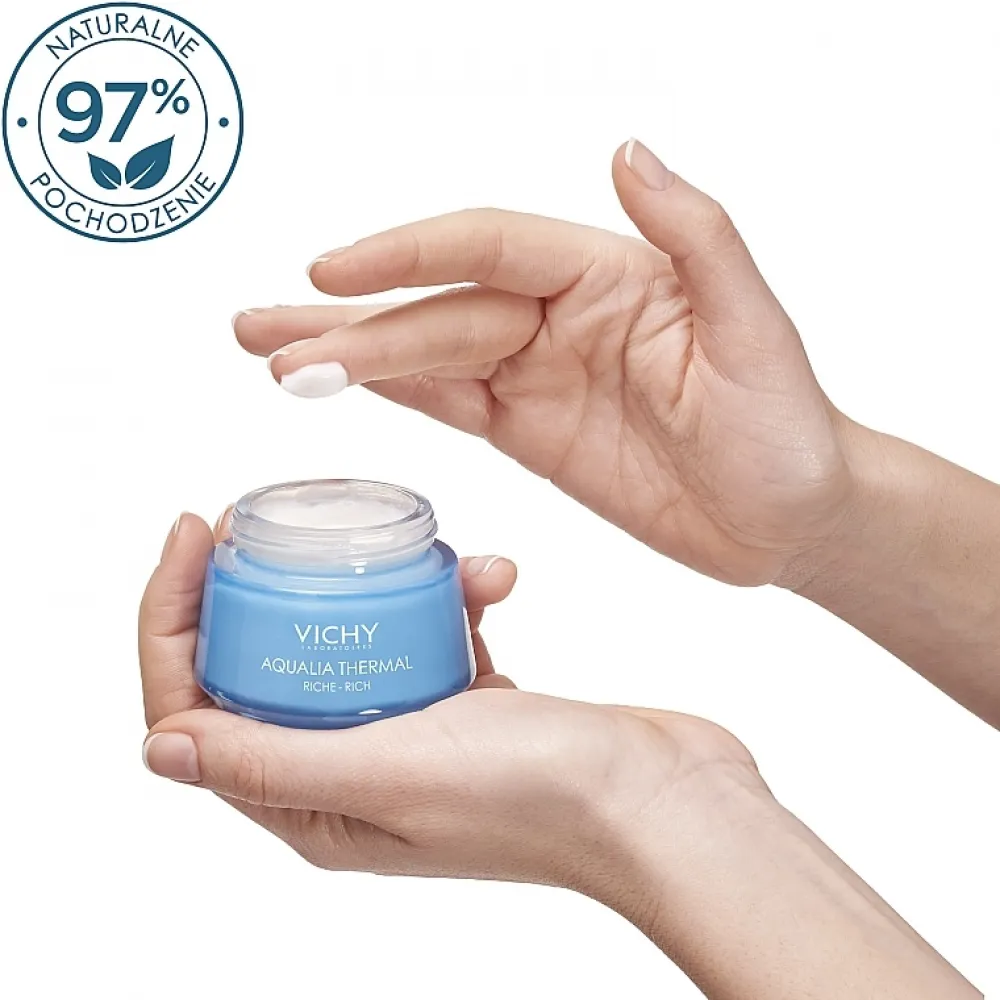 Крем Vichy Aqualia Thermal Riche призначений для інтенсивного зволоження сухої та дуже сухої шкіри. Його формула, збагачена термальною водою Vichy, гіалуроновою кислотою та рослинним цукром манозою, забезпечує шкірі 48 годин динамічного зволоження, відновлюючи її бар'єрні функції та надаючи відчуття комфорту та свіжості.