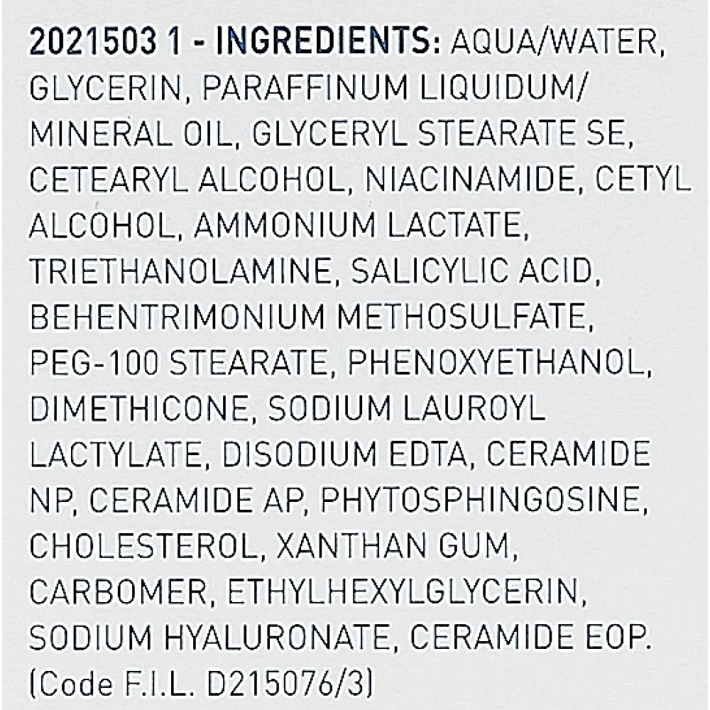 ingredients: AQUA/WATER, GLYCERIN, PARAFFINUM LIQUIDUM/MINERAL OIL, GLYCERYL STEARATE SE, CETEARYL ALCOHOL, NIACINAMIDE, CETYL ALCOHOL, АММОНИУМ LACTATE, TRIETHANOLAMINE, SALICYLIC ACID, BEHENTRIMON STEARATE, PHENOXYETHANOL, DIMETHICONE, SODIUM LAUROYL LACTYLATE, DISODIUM EDTA, CERAMIDE NP, CERAMIDE AP, PHYTOSPHINGOSINE, CHOLESTEROL, XANTHAN GUM, CARBOMER, ETHYLHEXYLGLYCER (FIL D215076/3).