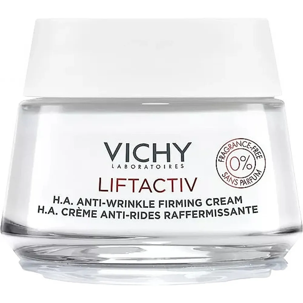 Денний антивіковий крем Vichy Liftactiv H.A. Crème de jour sans parfum призначений для нормальної та комбінованої шкіри, включаючи чутливу. Крем бореться з ознаками старіння: зморшками, втратою пружності та тьмяним кольором обличчя. Забезпечує інтенсивне зволоження, зміцнює шкіру та надає їй свіжий, сяючий вигляд. Легка текстура швидко вбирається і не залишає жирного блиску, підходить для використання під макіяж.
