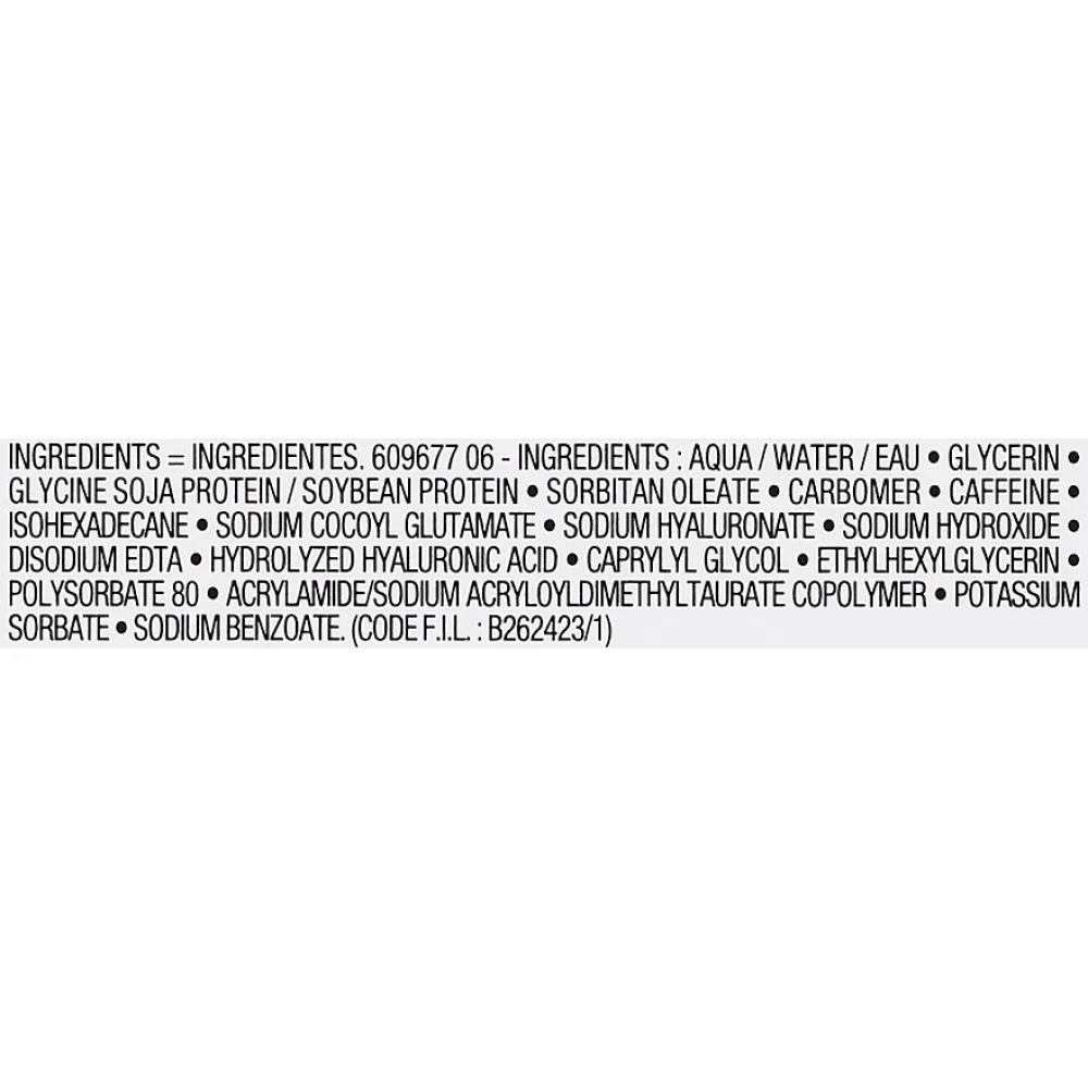 ingredients: aqua / water, glycerin, carbomer, glycine soja protein / soybean protein, caffeine, isohexadecane, sodium cocoyl, glutamate, sodium hyaluronate, sodium hydroxide, disodium edta, hydrolyzed hyaluronic acid, caprylyl glycol, polysorbate 80, acrylamide/sodium acryloyldimethyltaurate copolymer, potassium sorbate, sodium benzoate.